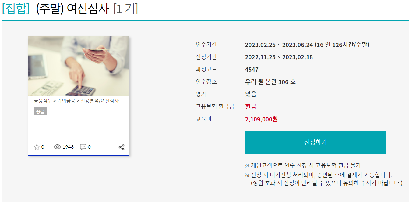 우리은행 등 메이저 은행권 채용시 여신심사역 자격증 취득자를 우대하고 있으나, 시험 응시자격을 얻기 위해서는 4백 만원 이상의 비용이 드는 한국금융연수원 집합연수과정을 수료해야 하기 때문에 취준생의 응시율이 낮습니다.