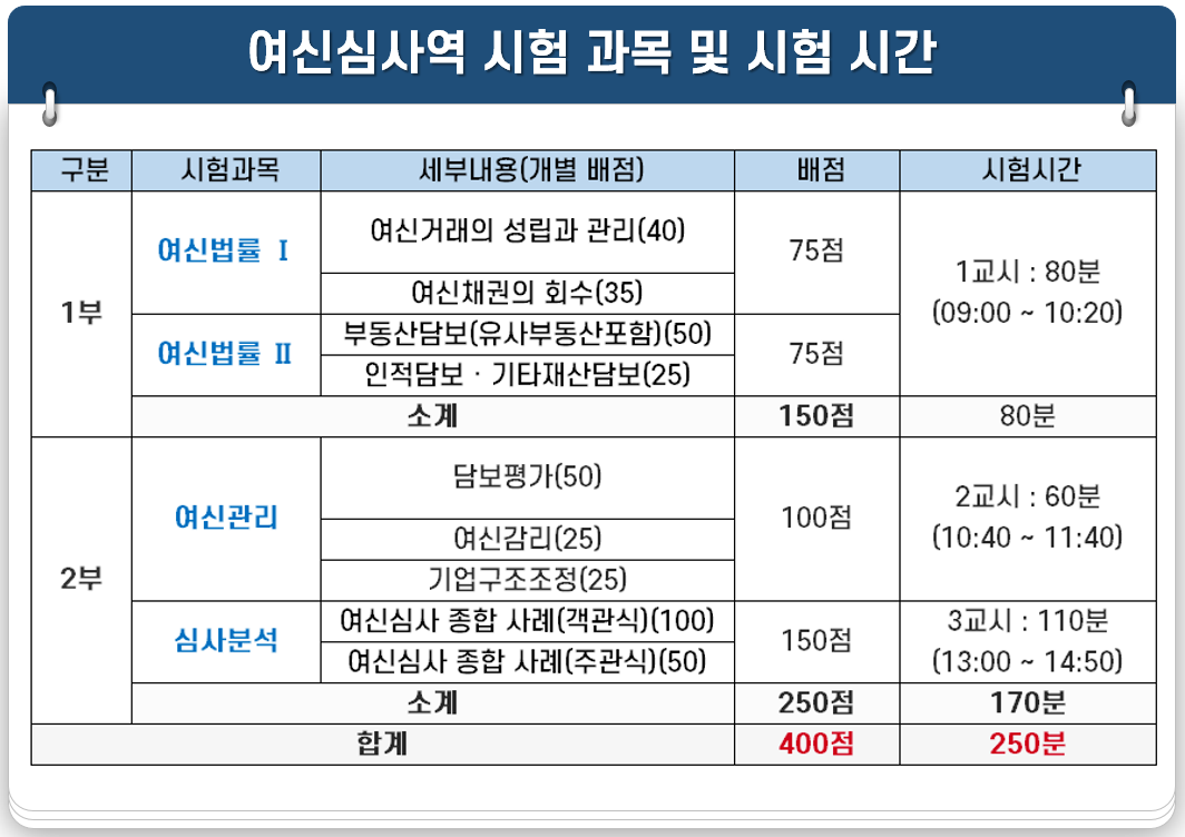 1부 시험은 여신법률Ⅰ과 여신법률 Ⅱ을 총 80분 동안, 2부 시험은 과목별로 시험 시간을 나누어 여신관리 60분, 심사분석 110분 동안 시험을 치르게 됩니다.