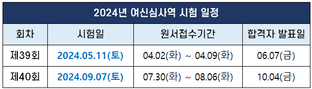 여신심사역 시험은 1년에 2회, 통상 5월, 9월에 시행됩니다.
