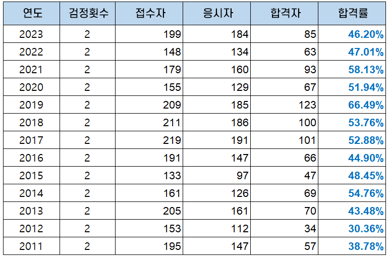 2023년에는 184명의 응시자 중 85명이 합격해 46.2%의 합격률을 보였습니다.
