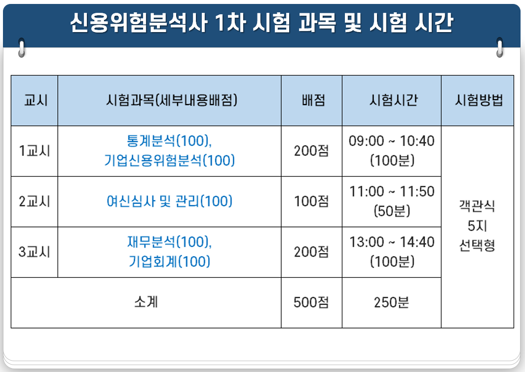 신용위험분석사 1차 시험은 통계분석, 기업신용위험분석, 여신심사 및 관리, 재무분석, 기업회계 5과목으로 구성되며 객관식 5지 선택형 문제가 출제됩니다.