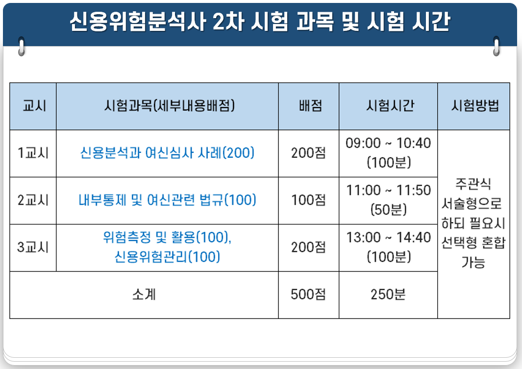 신용위험분석사 2차 시험은 신용분석과 여신심사 사례, 내부통제 및 여신관련 법규, 위험측정 및 활용, 신용위험관리 4과목으로 구성되며 주관식 서술형으로 문제가 출제됩니다.