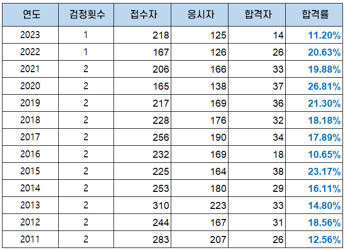 | 연도 | 접수자 | 응시자 | 합격자 | 합격률 |