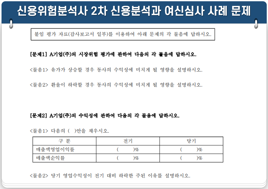 신용분석과 여신심사 사례는 평가대상 기업의 재무 및 비재무적 정보를 분석하여 답을 구하는 유형으로 20문제 내외(200점)가 출제됩니다.