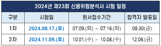 2024년 제23회 신용위험분석사 시험 일정은 아래 표와 같습니다.