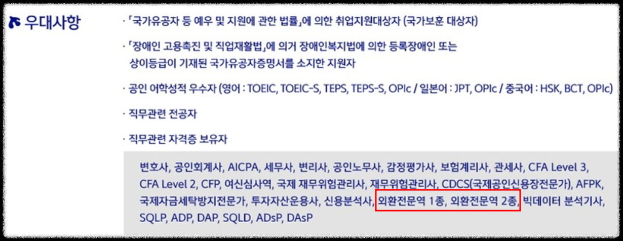 외환전문역은 신한은행, 우리은행, 광주은행, 제주은행 등 각종 은행 신입 공채에서 우대 자격증으로 명시하고 있는 자격증입니다.