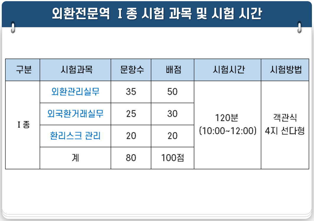 외환전문역 Ⅰ종 시험은 외환관리실무, 외국환거래실무, 환리스크관리 3과목으로 구성되며 객관식 4지 선택형 80 문제가 출제됩니다.