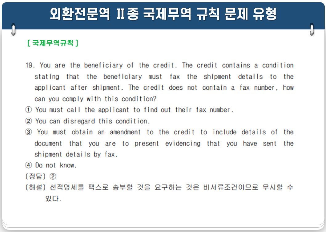 외환전문역 Ⅱ종 기출 문제와 영어로 출제되는 국제무역규칙 과목 학습가이드(샘플문제포함)를 첨부합니다.