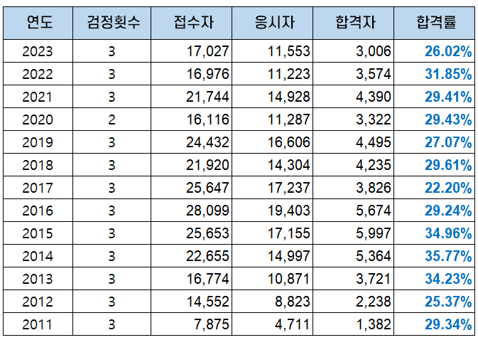 2023년에는 11,553명의 응시자 중 3,006명이 합격해 26.02%의 합격률을 보였습니다.