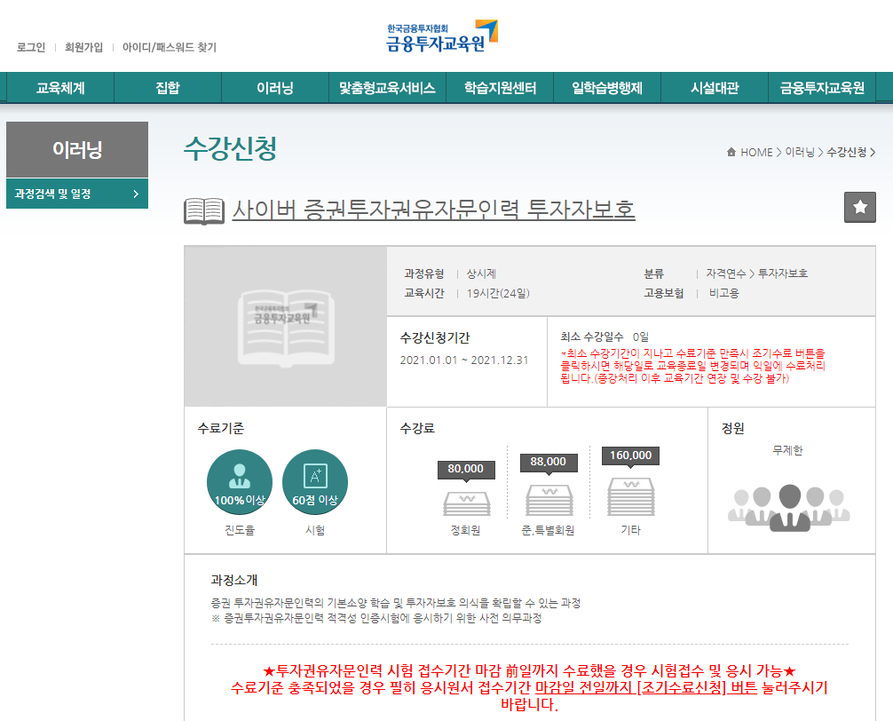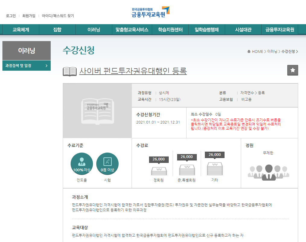 펀드, 증권, 파생상품 투자권유자문인력 투자자 보호 교육은 시험 응시가 가능한 「금융투자전문인력과 자격시험에 관한 규정」에서 정한 금융회사 등의 임직원과 경력 1년 이상의 투자권유대행인, 보험설계사 등만 가능합니다.