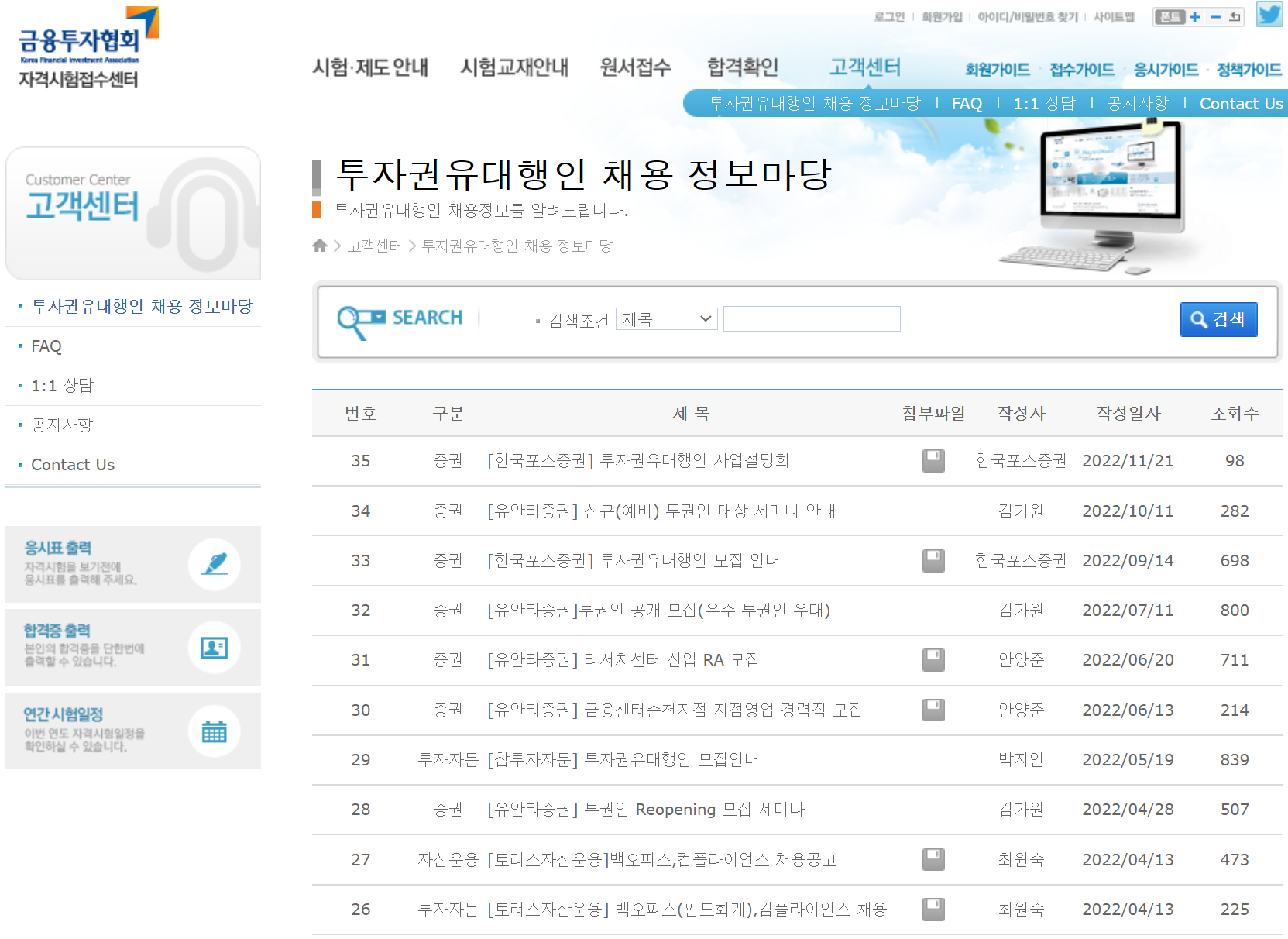 투자자문회사나 증권회사 등 투자권유대행인이 필요한 금융기관에서는 자격증 취득을 위한 교육비 등을 지원해주고 있으니 금융투자협회의 채용 정보마당을 통해 관련 정보를 확인하시기 바랍니다(아래 그림을 클릭하면 연결됩니다).