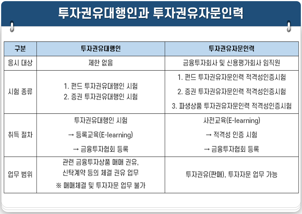 | 구분 | 투자권유대행인 | 투자권유자문인력 |