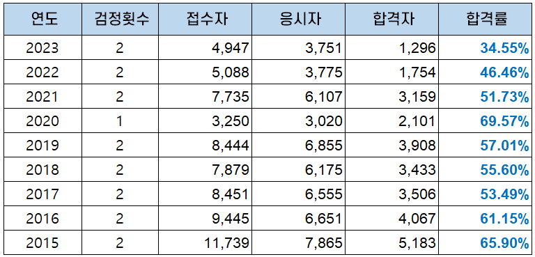 코로나 19로 1회만 시행된 2020년에는 3,020명의 응시자 중 2,101명이 합격하여 시험 시행 이래 가장 높은 69.57%의 합격률을 기록했고, 2021년에는 6,107명의 응시자 중 3,159명이 합격해 51.73%의 합격률을 보였습니다.