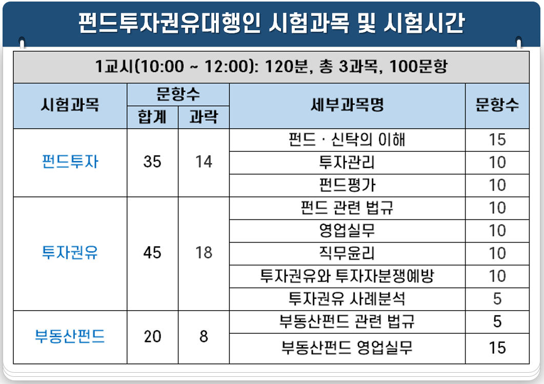 펀드투자권유대행인 시험은 '펀드 투자', '투자 권유', '부동산펀드'의 3과목으로 구성됩니다.