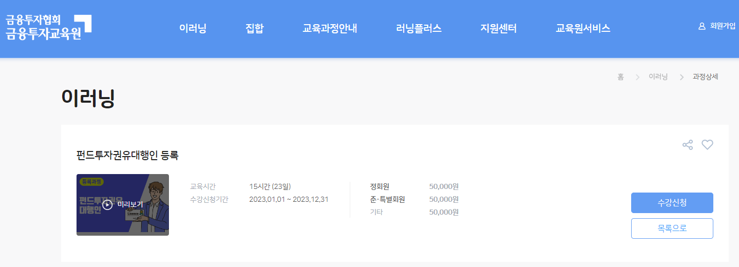 사이버 펀드투자권유대행인 등록 교육 비용은5만 원이며, 교육 시간은 15시간입니다.