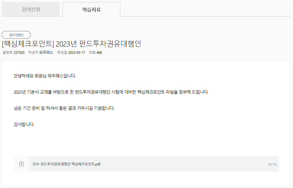 온라인 강의는 이패스코리아, 와우패스, 한국직업개발원(KFO), 해커스 금융에서 수강 가능하며, 와우패스에서는 펀드투자권유대행인 핵심 요약 자료를 pdf 파일로 제공하고 있습니다(아래 그림을 클릭하시고 와우패스에 로그인하시면 pdf파일을 다운로드할 수 있습니다).