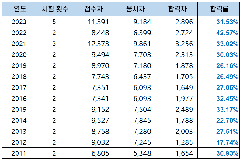 비대면 온라인 시험 방식으로 전환되면서 연간 5회 시험이 시행되었던 2023년에는 9,184명의 응시자 중 2,896명이 합격해 31.53%의 합격률을 나타냈습니다.