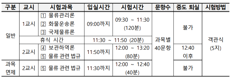 시험문제는 과목마다 객관식 5지 선택형 40문제가 출제되며, 물류관리론, 화물운송론, 국제물류론 3과목은 1교시에 120분 동안, 보관하역론과 물류관련법규 2과목은 2교시에 80분 동안 시험을 봅니다.