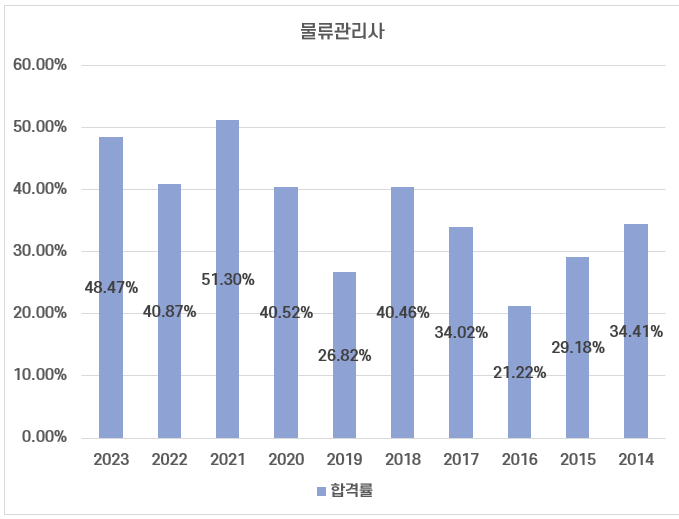 최근 시행된 물류관리사 시험 평균 합격률은 약 37%이고, 시험의 난이도에 따라 21%~51% 사이 합격률 분포를 보이고 있습니다.
