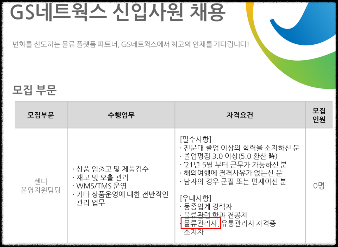 현대 글로비스 같은 종합 물류회사, GS네트웍스 같은 물류대행업체, 이마트 같은 유통 업체에서도 채용 시 물류관리사 자격증 소지자를 우대하고 있어 취업 준비생이 많이 준비하는 자격증입니다.