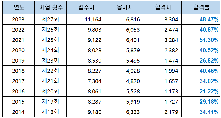 | 연도 | 시험 횟수 | 접수자 | 응시자 | 합격자 | 합격률 |