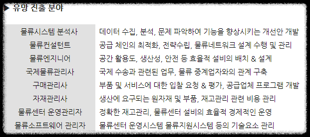 하지만, 물류관련 정부투지기관이나 공사, 기업의 물류 관련 부서(물류, 구매, 자재, 수송 등), 물류 연구기관에서 물류관리사 자격증 소지자를 우대하고 있습니다.