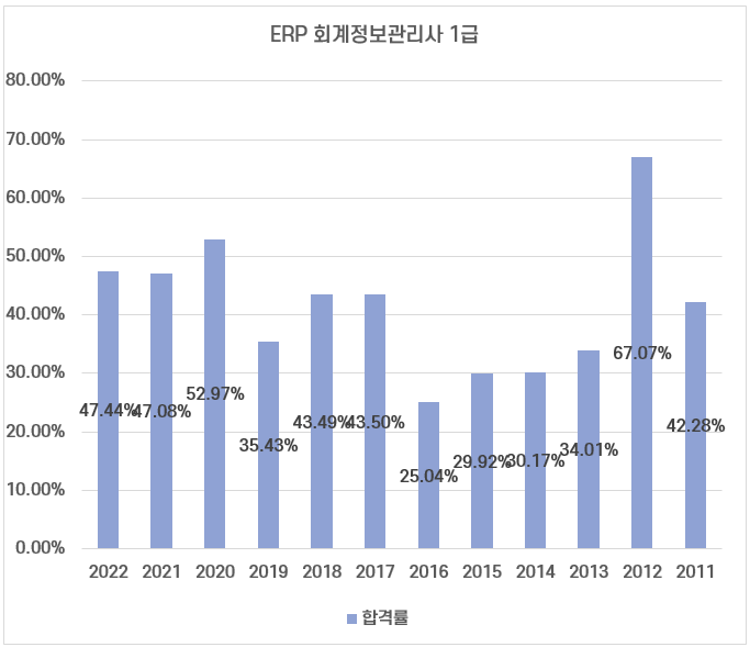 2011년부터 2022년까지 ERP 회계정보관리사 1급 접수자, 응시자, 합격자 및 합격률은 다음과 같습니다.