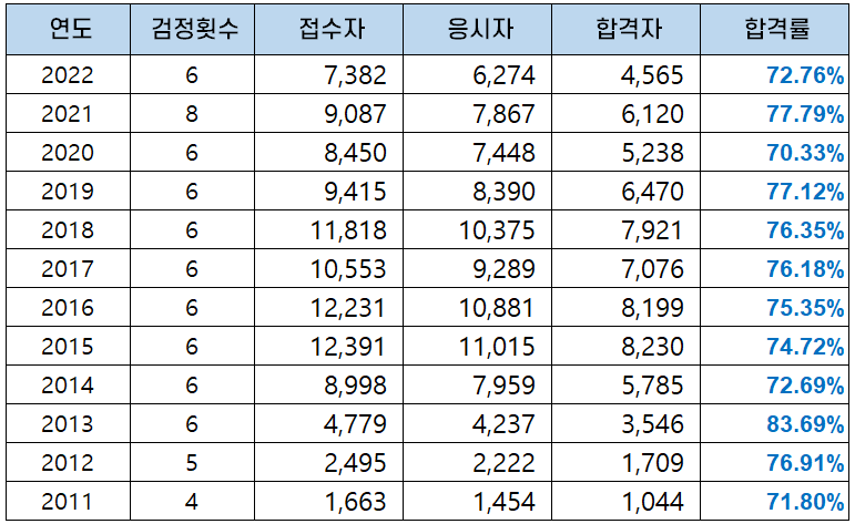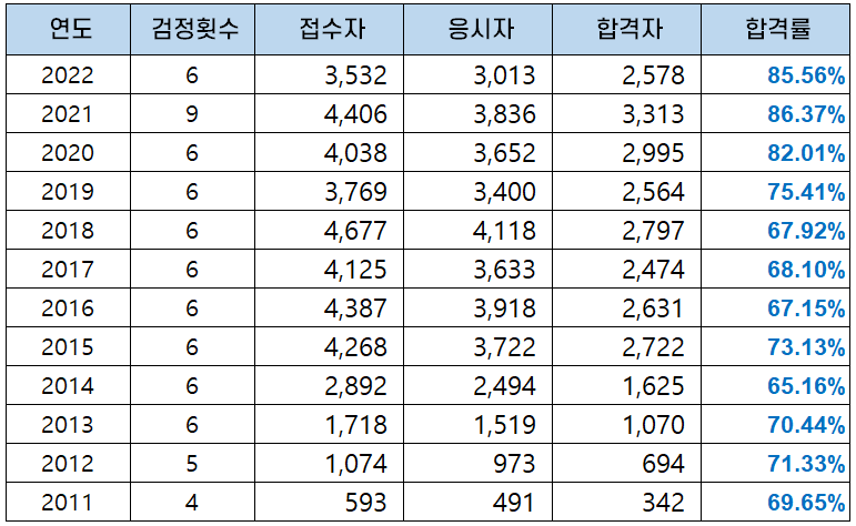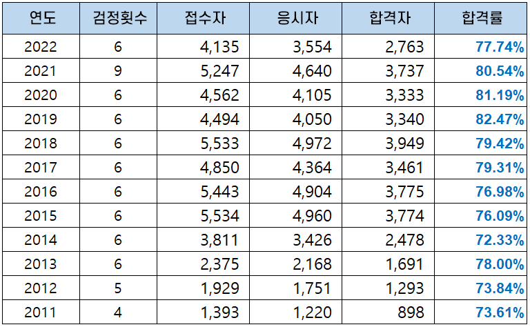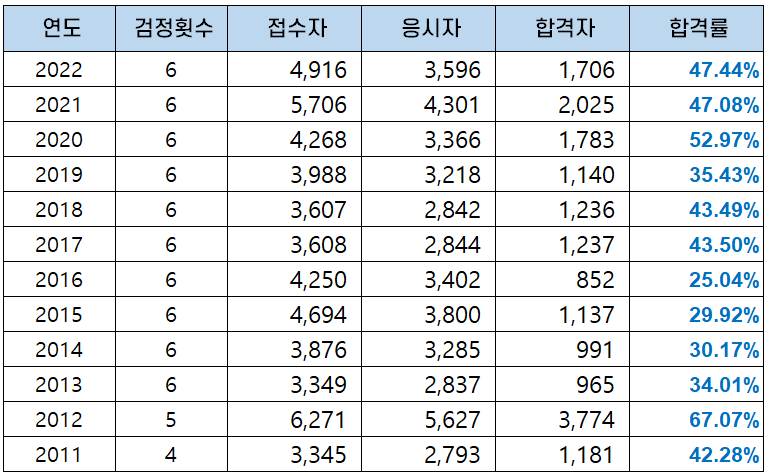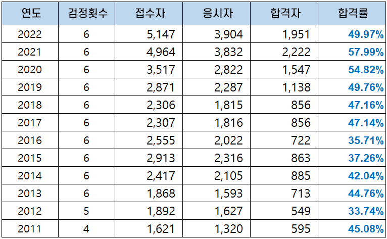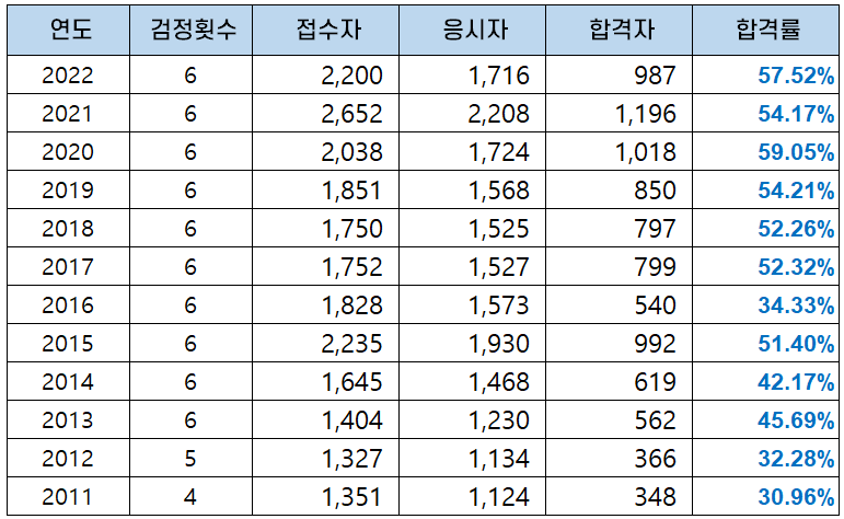 2020년에 1,724명의 응시자 중 1,018명이 합격하여 합격률은 59.05%를 기록했고, 역대 가장 많은 인원인 2,208명이 응시한 2021년에는 1,196명이 합격해 54.17%의 합격률을 보였으며, 2022년에는 1,716명의 응시자 중 987명이 합격해 57.52%의 합격률을 나타냈습니다.