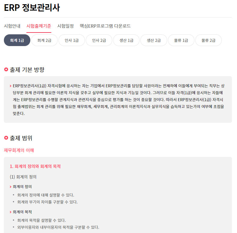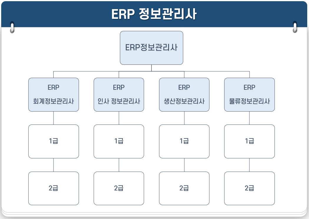 국내 유일의 ERP 분야 공인 자격증인 ERP 정보관리사는 회계, 인사, 생산, 물류의 4개 모듈로 나누어져 있고, 모듈 별로 1급과 2급으로 구분됩니다.