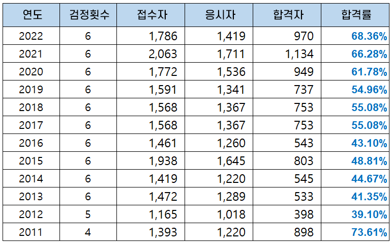 2020년에 1,536명의 응시자 중 949명이 합격하여 합격률은 61.78%를 기록했고, 역대 가장 많은 인원인 1,711명이 응시한 2021년에는 1,134명이 합격해 66.28%의 합격률을 보였으며, 2022년에는 1,419명의 응시자 중 970명이 합격해 68.36%의 합격률을 나타냈습니다.