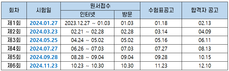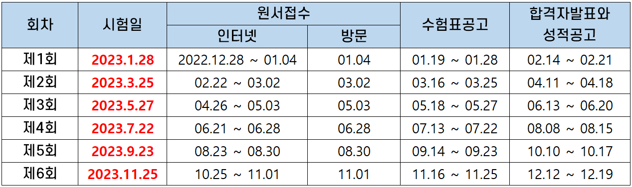 | 회차 | 시험일 | 원서접수 | 합격자발표와 성적공고 |