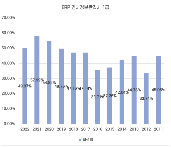 2011년부터 2022년까지 ERP 인사정보관리사 1급 접수자, 응시자, 합격자 및 합격률은 다음과 같습니다.