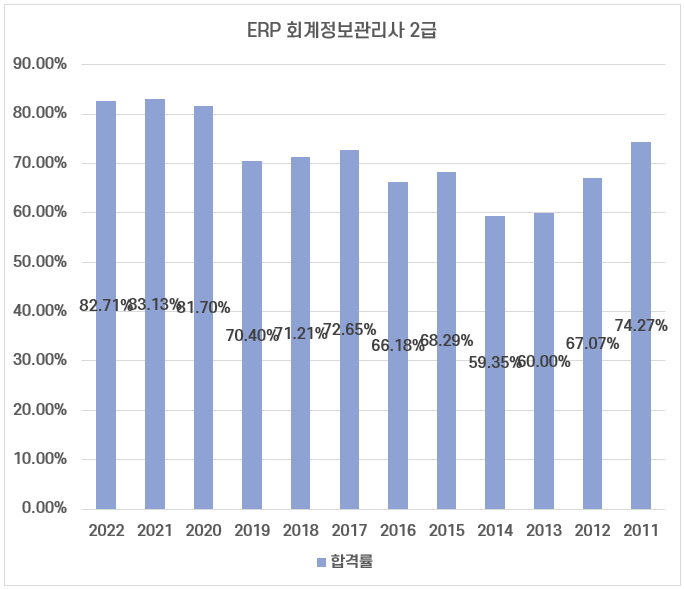 2011년부터 2022년까지 ERP 회계정보관리사 2급 접수자, 응시자, 합격자 및 합격률은 다음과 같습니다.