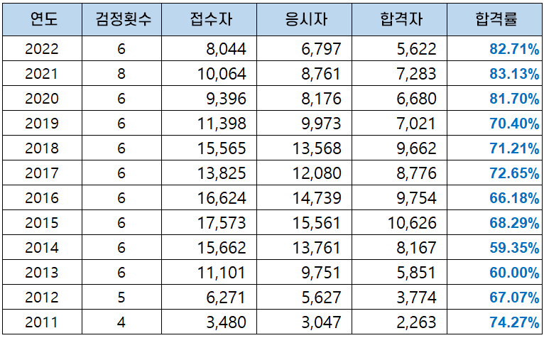 2020년에 8,176명의 응시자 중 6,680명이 합격하여 합격률은 81.70%를 기록했고, 2021년에는 8,761명이 응시자 중 7,283명이 합격해 83.13%로 역대 가장 높은 합격률을 보였으며, 2022년에는 6,797명의 응시자 중 5,622명이 합격해 82.71%의 합격률을 나타냈습니다.