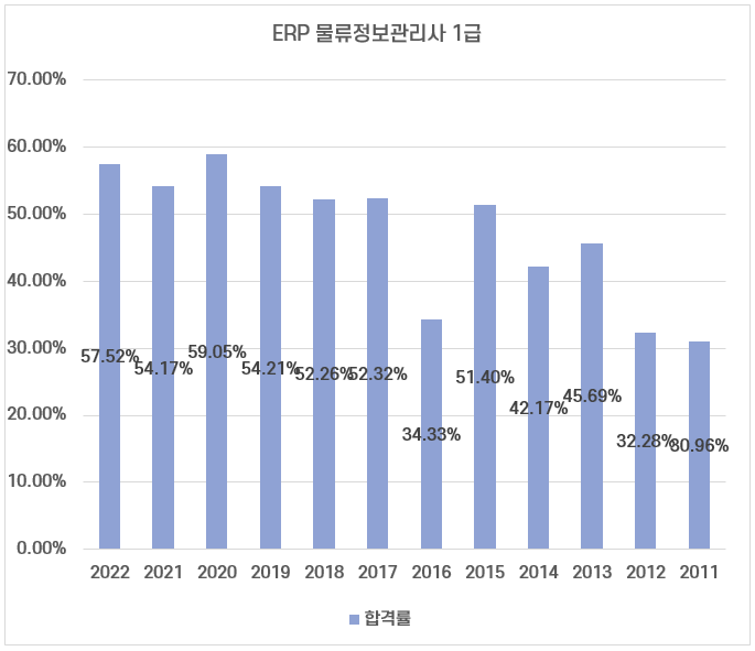 2011년부터 2022년까지 ERP 물류정보관리사 1급 접수자, 응시자, 합격자 및 합격률은 다음과 같습니다.