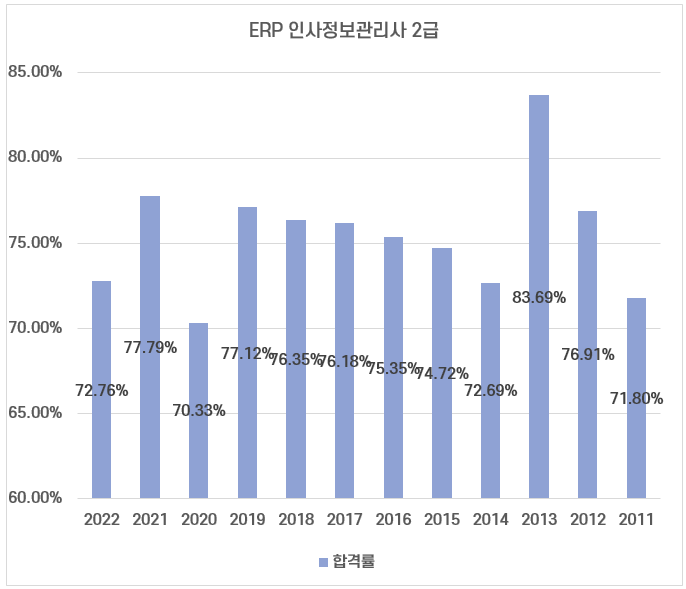 2011년부터 2022년까지 ERP 인사정보관리사 2급 접수자, 응시자, 합격자 및 합격률은 다음과 같습니다.