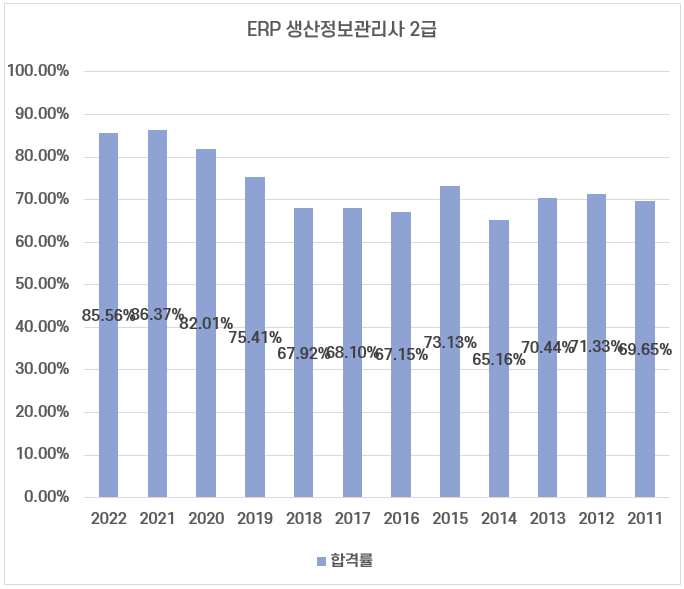 2011년부터 2022년까지 ERP 생산정보관리사 2급 접수자, 응시자, 합격자 및 합격률은 다음과 같습니다.