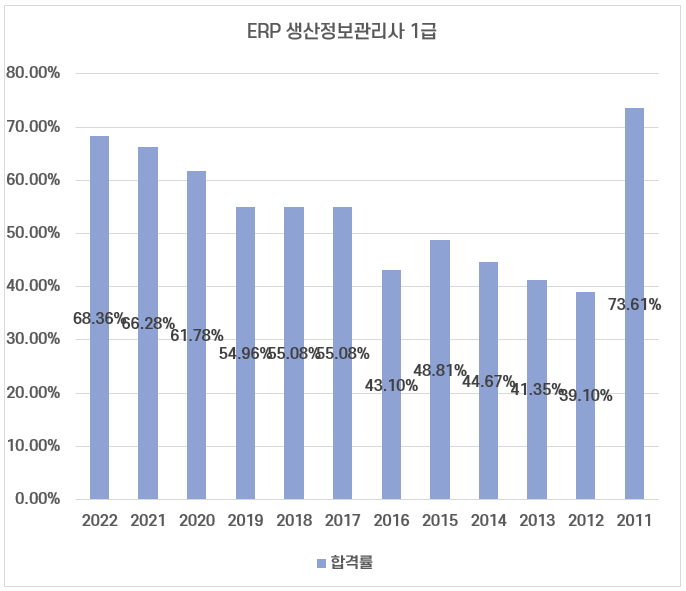 2011년부터 2022년까지 ERP 생산정보관리사 1급 접수자, 응시자, 합격자 및 합격률은 다음과 같습니다.