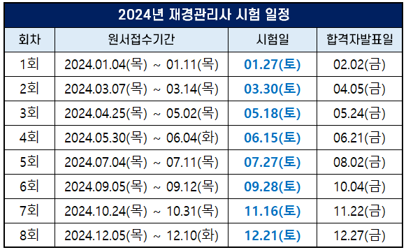 2024년 재경관리사 시험일, 원서접수기간 및 합격자 발표일 등 시험 일정은 다음과 같습니다.
