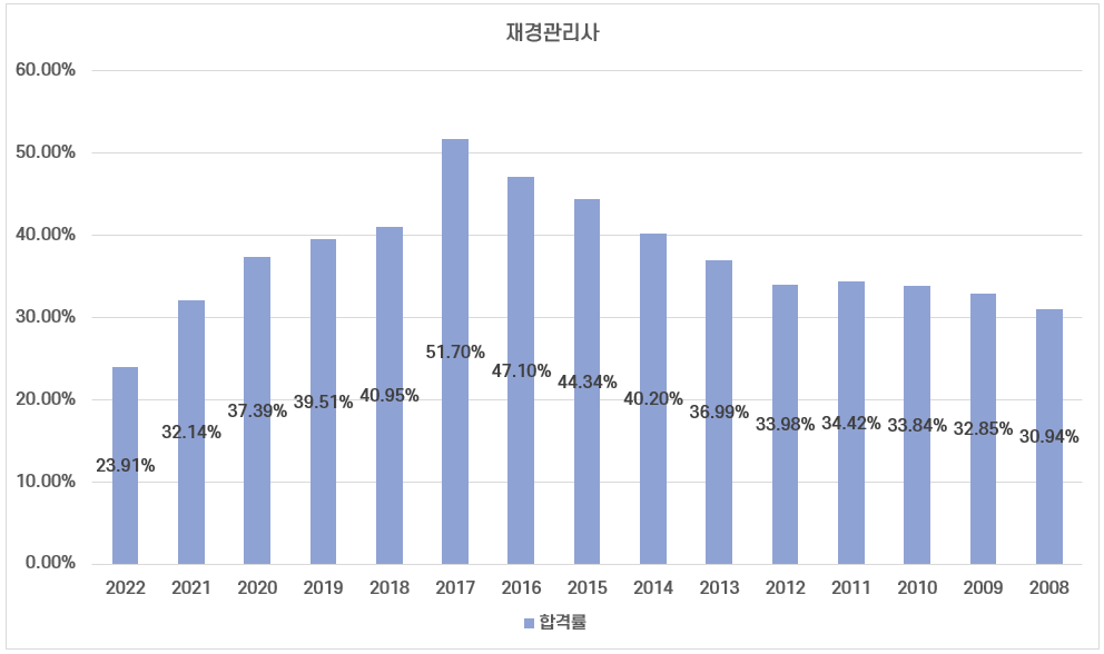 지난 15년간 재경관리사 시험 평균 합격률은 36.74%이고, 시험의 난이도에 따라 23%~52% 사이 합격률 분포를 보이고 있습니다.