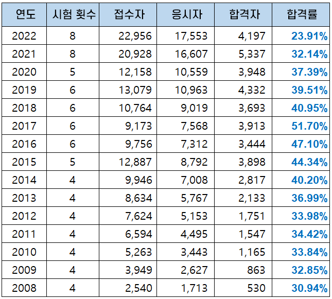 2022년에는 역대 가장 많은 인원인 17,553명이 응시했는데 4,197명이 합격해 23.91%의 합격률을 보여 최근 15녀간 가장 낮은 합격률을 기록했습니다.