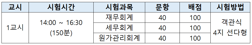 | 1교시 | 14:00 ~ 16:30 (150분, 3과목동시) |