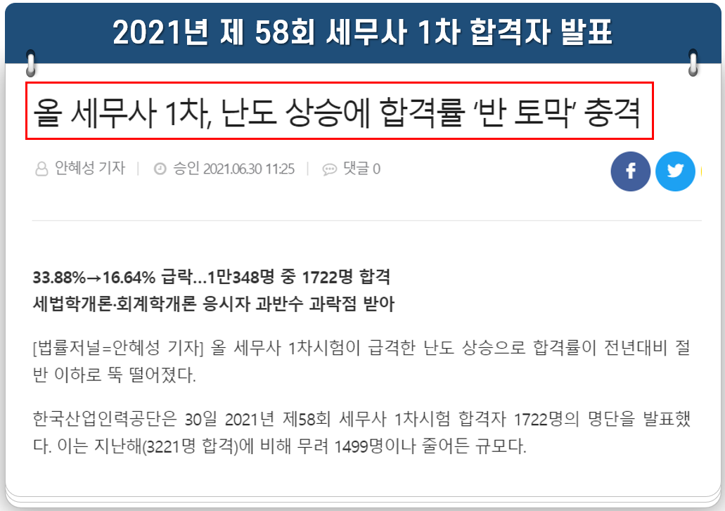 2021년 제58회 세무사 1차 시험 합격자 발표