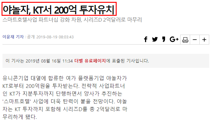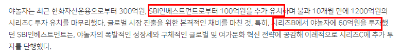 이유: 야놀자에 2016년 4월 60억, 2018년 5월 100억을 투자하여 총 160억 투자