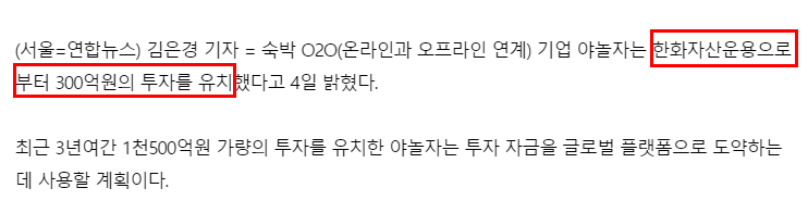 이유: 2018년 5월 한화자산운용이 야놀자에 300억 투자. 비상장사인 한화자산운용이 한화투자증권의 최대주주임.