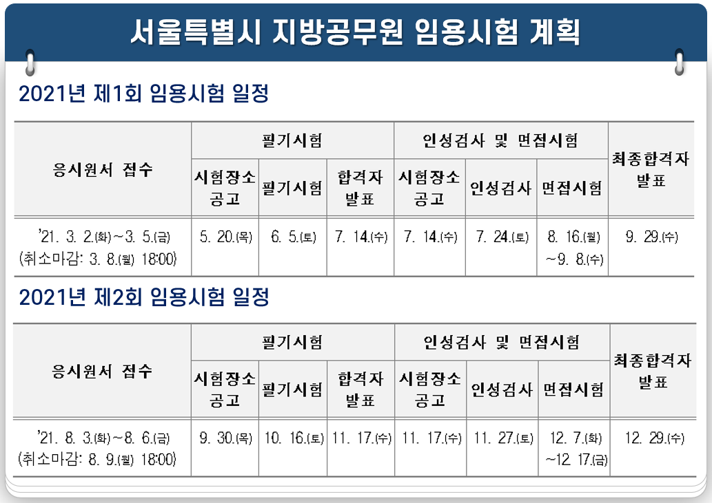 2021년 서울시 지방 공무원 공개경쟁 및 경력경쟁 임용시험은 2020년 시험 일정과 비슷하게 2021년 6월 5월(토)에 2021년도 제1회 시험이, 2021년 10월 16일(토)에 2021년도 제2회 시험이 시행됩니다. 서울시 지방직 공무원 임용시험 공고부터 원서접수일, 필기시험 일 등 시험 일정은 아래와 같습니다.