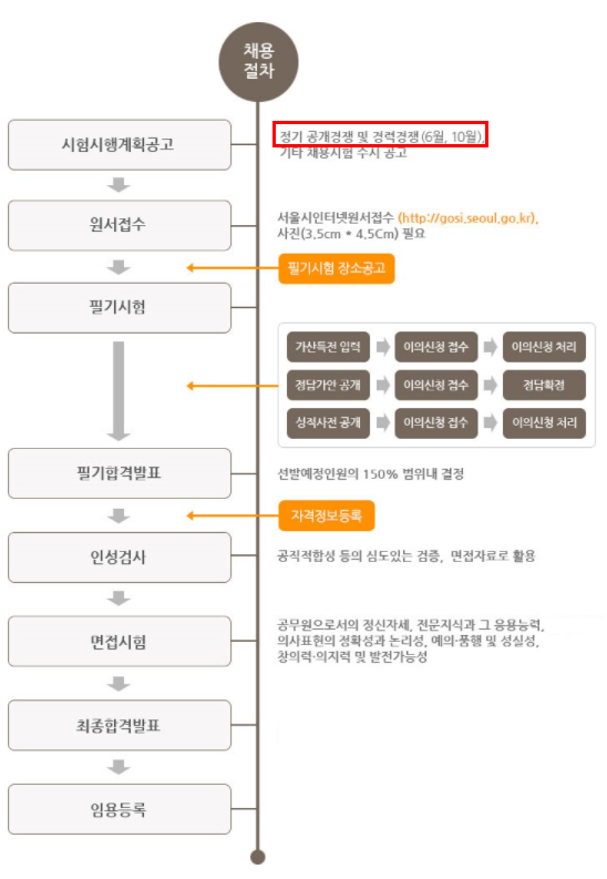 서울특별시는 2021년부터 1년에 2번 정기 공개 경쟁 및 경력 경쟁 공무원 임용시험을 통해 서울시 7급 9급 지방직 공무원을 선발하고 있습니다.