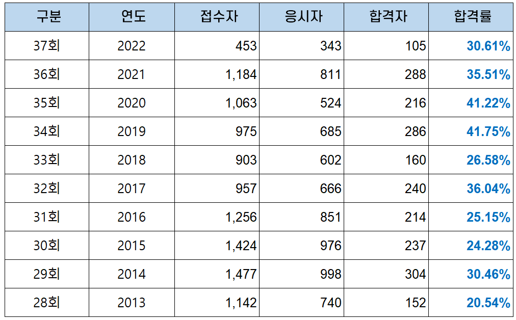 경영지도사 2차 시험도 절대평가이다 보니 매년 시험의 난이도에 따라 합격자 수와 합격률의 변동이 큰 편입니다.