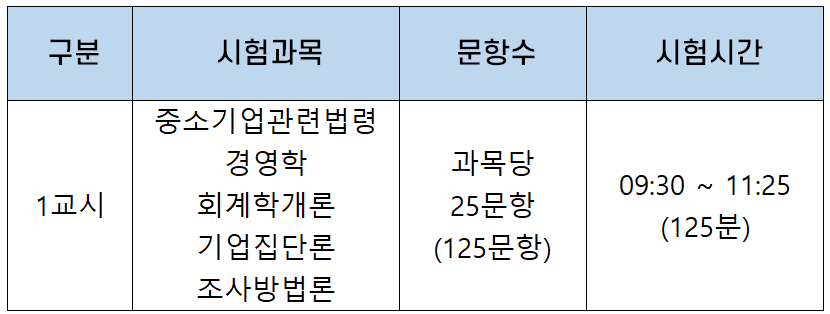 | 1교시 | 중소기업관련법령 경영학 회계학개론 기업집단론 조사방법 |