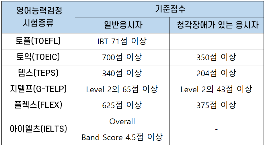 | 아이엘츠(IELTS) | Overall Band Score 4.5이상 | - |